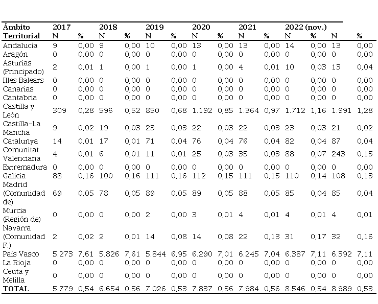 En este sentido, el País Vasco ha crecido continuamente desde muy temprano y con números importantes en comparación con el resto de las comunidades autónomas. Tal es así que un 71,11% de las prestaciones económicas de asistencia personal reconocidas a 30 de noviembre de 2022 en España lo están en el País Vasco. Desde el 2012, Castilla y León viene apostando por su implementación, multiplicando por más de 35 las prestaciones de asistencia personal reconocidas en 2013 (1.991 frente a 56). Consecuentemente, ambos territorios alcanzan conjuntamente 93,26% de todas las prestaciones de asistencia personal reconocidas en el SAAD en España.