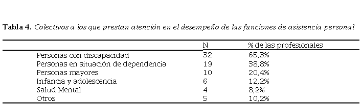 Profundizando en las personas para las que trabajan, el principal colectivo es el de personas con discapacidad (65,3%). En el lado opuesto, se encuentra el ámbito de la salud mental (8,2%), sobre el que Prieto et al. (2019) y Ruiz (2016), refiriéndose a la discapacidad intelectual, afirman que cuenta con un menor acceso al servicio (Tabla 4).