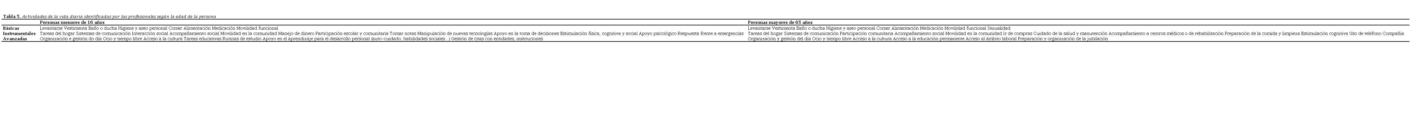 En cuanto a las actividades de la vida diaria en estos dos grupos de edad: menores de 16 y mayores de 65 años, en la Tabla 5 se presentan sus aportaciones. Muchas de ellas coinciden con el contenido prestacional de servicios ya consolidados, como el Servicio de ayuda a domicilio, pero muchas otras translucen un concepto de cuidado en sentido amplio, con ocupaciones significativas según el curso vital como la sexualidad o la participación en recursos de ocio. Rodríguez-Picavea y Romañach (2006) identifican ocho grandes categorías de tareas: personales, del hogar, de acompañamiento, de conducción, de comunicación, de coordinación, excepcionales y especiales. Como se observa en las respuestas obtenidas, las tareas que realizan se relacionan con dichas categorías existiendo diferencias según el grupo de edad como las relacionadas con la esfera sexual, no incluidas en menores de 16 años. Igualmente, destaca la inclusión de tareas de rehabilitación y compañía para personas mayores de 65 años, anticipando la influencia de los procesos de envejecimiento de las personas y las situaciones de soledad. Lo que vincula muchas de las tareas de cuidados con la propia supervivencia de la persona (Tobío et al., 2010).