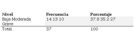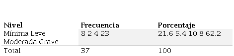 De acuerdo a los resultados del Inventario de Depresión de Beck II (BD1-2) (Tabla 3), el 21.6% manifiesta depresión mínima (0-13), el 5.4% en depresión leve (14-19), el 10.8% en depresión moderada (20-28) y el 62.2% con depresión grave (29-63), con una media total M=29.27. Esto de acuerdo a los puntajes obtenidos, descritos por Sanz et. al (2014).