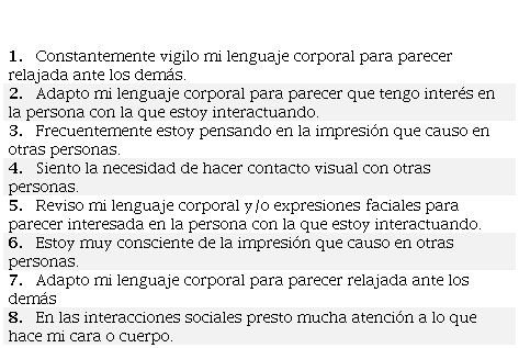 Cuestionario para reconocer el enmascaramiento autista. Consta de 8 ítems con 7 opciones que van de 1 = muy en desacuerdo, 2 = en desacuerdo, 3 = algo en desacuerdo, 4 = ni de acuerdo ni en desacuerdo, 5 = algo de acuerdo, 6 = de acuerdo y 7 = muy de acuerdo.