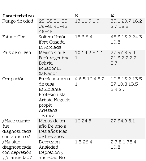 Las participantes estuvieron conformadas por 37 mujeres autistas sin discapacidad intelectual cuyas edades se sitúan entre 25 a los 48 años con una media m= 34.14 y una desviación estándar DS = 7.21; el país de origen del 27% corresponde a México, 37.8% proviene de Chile, 5.4% de Perú, 21.6% de Argentina, 2.7 de Bolivia, Ecuador y El Salvador. Sobre su estado civil, el 48.6% se encuentra soltera, 16.2% está en unión libre, 24.3% se encuentra casada y el 10.8% está divorciada. Respecto a sus ocupaciones, el 10.8% son empleadas, 16.2% amas de casa, 13.5% estudiantes, 27% profesionistas, 10.8% artistas, 13.5 % tiene un negocio propio, el 5.4 es artesana y el 2.7 son técnicas (Tabla 1).