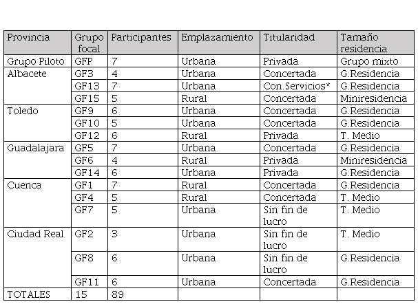 La muestra intencional incluyó un total de quince residencias de mayores situadas en la región de Castilla-La Mancha. Se trata, en todos los casos, de residencias de gestión privada de los servicios. Se excluyeron de la muestra todas las residencias de titularidad completamente pública, pues estos centros no tienen en plantilla trabajadoras únicamente con certificados profesionalidad, regulados por el Ministerio de Empleo.