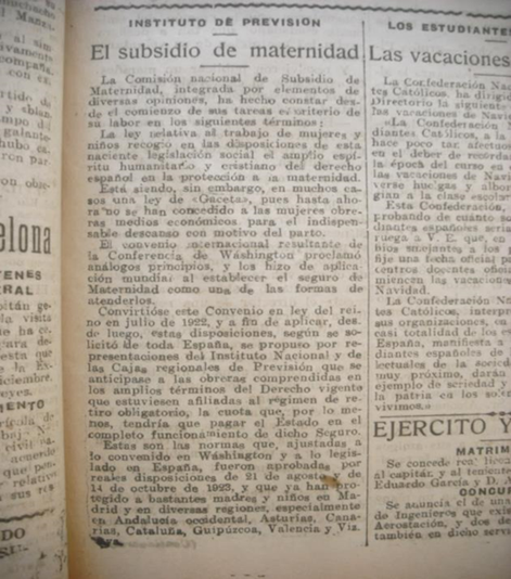 Los semanarios de la época publicitan el subsidio de maternidad como “una nueva conquista del proletariado y un avance sintomático de gran significación”; se dice que, desde la fecha, todas las mujeres obreras que estén inscritas en el retiro obligatorio y cumplan las condiciones fijadas en el “Decreto de agosto de 1923”, tendrán derecho a un “subsidio de cincuenta pesetas en caso de parto”; el modo de obtener la suma es pedir información al INP de Madrid o a las Cajas colaboradoras del retiro obligatorio en toda España; el crédito necesario para atender al subsidio está firmado por el Gobierno previamente establecido y aprobado en las Conferencias Internacionales del Trabajo; pero en la localidad[Se cita el caso de la ciudad de Elche, como representativa de industria local del momento dentro de la provincia de Alicante y del contexto mediterráneo], esta ley no tiene aplicación, a pesar de existir muchas obreras que tendrían derecho a solicitarlo; el motivo es que ningún patrono de la ciudad ha inscrito a sus operarias en el INP, condición indispensable para tener derecho al subsidio, porque de haberlo hecho tendrían que pagar una prima al Instituto (Trabajo, 1923, 677). De este hecho queda constancia en la publicación del Decreto de 1931 para su resolución: