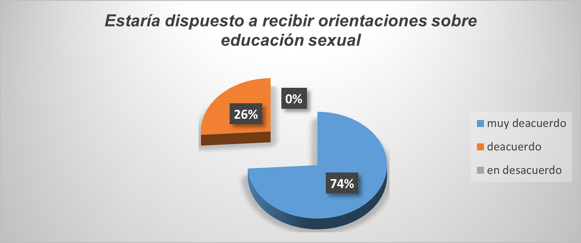 Análisis: Correspondiente a la pregunta nueve, sobre si estaría dispuesto a recibir orientaciones sobre educación sexual, los encuestados respondieron con un 74% seguido con un 26% que manifestó estar de acuerdo, estos altos porcentajes manifiestan el gran interés que poseen los alumnos en educarse para tener mayores conocimientos respecto a su cuerpo y su sexualidad.