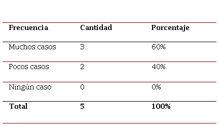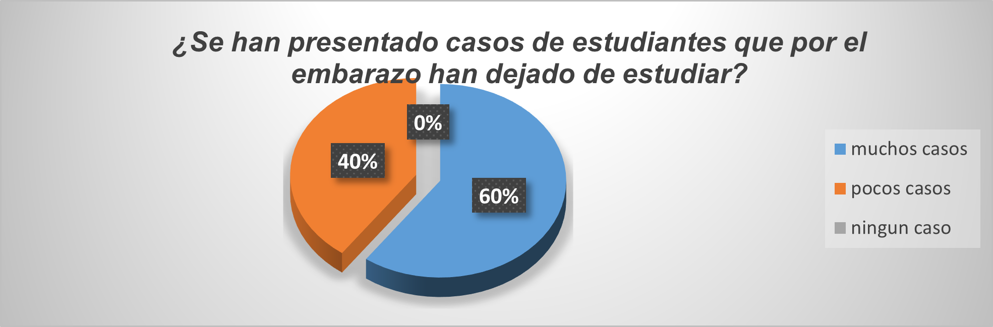 Análisis: Con respecto a la pregunta dos, de la encuesta dirigida hacia los docentes sobre si se han presentado casos de estudiantes que por el embarazo han dejado de estudiar, ellos respondieron con un 60% muchos casos y con el 40% pocos casos, esto refleja que un alto porcentaje de docentes conoce muchos casos de deserción escolar.