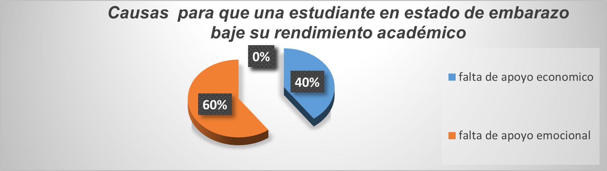 Análisis: En relación con la pregunta tres, sobre cuáles serían las causas para que una estudiante en estado de embarazo baje su rendimiento académico, ellos manifestaron con un 60% la falta de apoyo emocional, y con el 40% la falta de apoyo económico, esto indica con un alto porcentaje que la falta de apoyo emocional es más relevante para un bajo rendimiento de las estudiantes embarazadas.