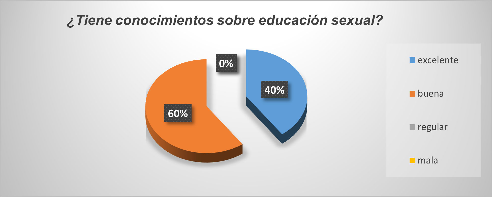 Análisis: Estos resultados adquiridos en la pregunta cuatro, sobre los docentes tienen o no conocimiento sobre educación sexual, los encuestados manifestaron con un 60% buena, seguido con 40% excelente, lo que refleja que los docentes de la unidad educativa tienen buenos conocimientos sobre educación sexual.