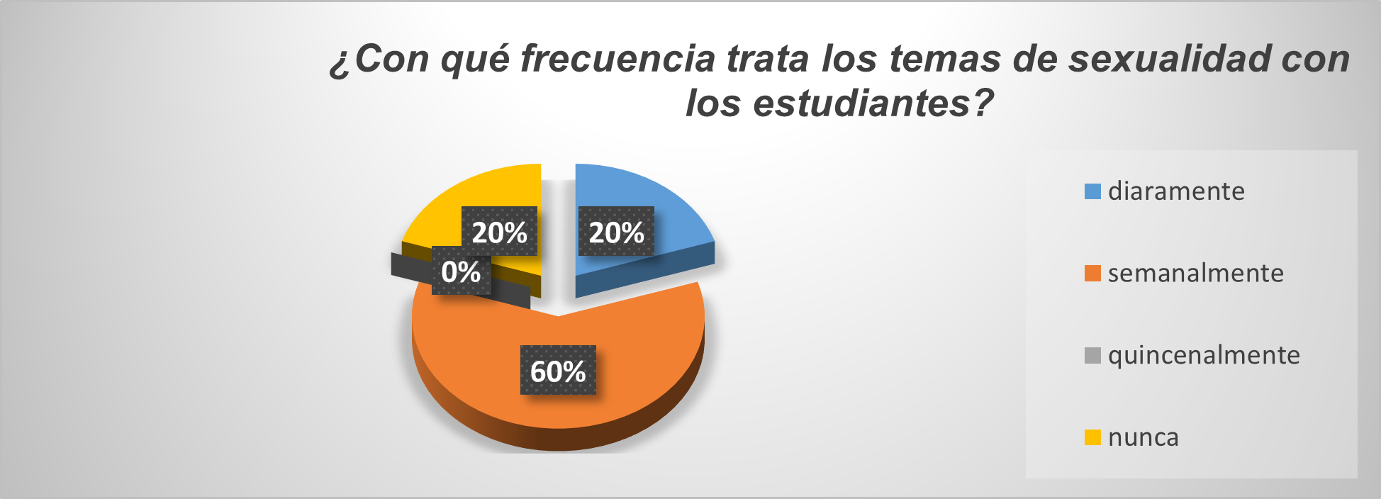 Análisis: Correspondiente a la pregunta cinco, que trata sobre si los docentes inculcan los temas de sexualidad en el aula, manifestaron con un 60% semanalmente, un 20% diariamente y seguido con el 20% nunca, esto indica que un alto porcentaje de los docentes tratan los temas de sexualidad en el aula.