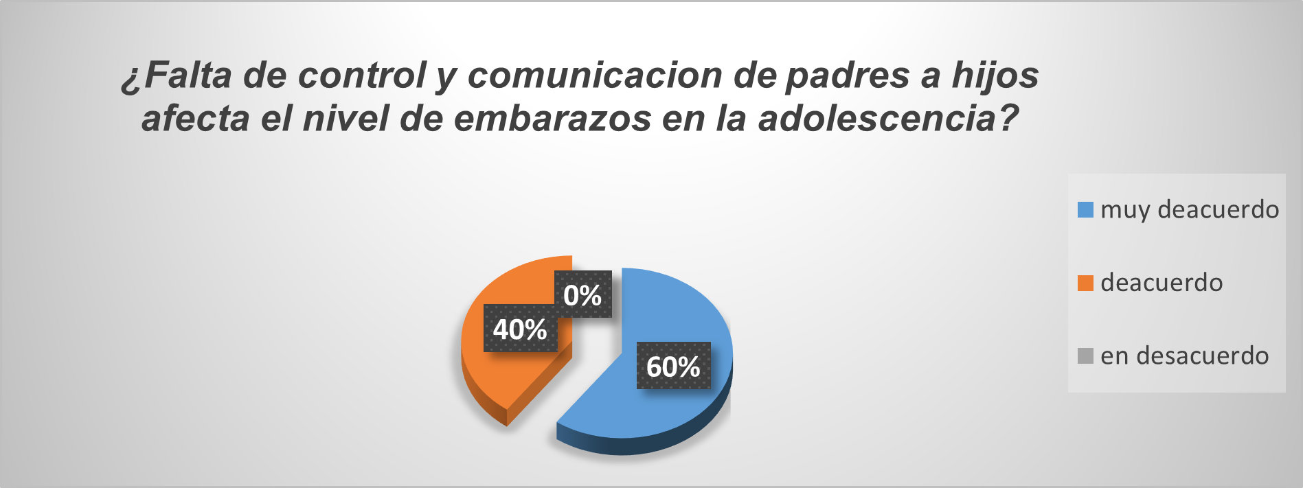 Análisis: Con respecto a la pregunta seis, que trata sobre si la falta de control y comunicación de padres a hijos afecta el nivel de embarazos en la adolescencia, aseguraron con el 60% estar muy de acuerdo, seguido de un 40% de acuerdo, lo que indica que un alto porcentaje de los docentes consideran que la falta de control y comunicación afecta en el nivel de embarazo en la adolescencia.