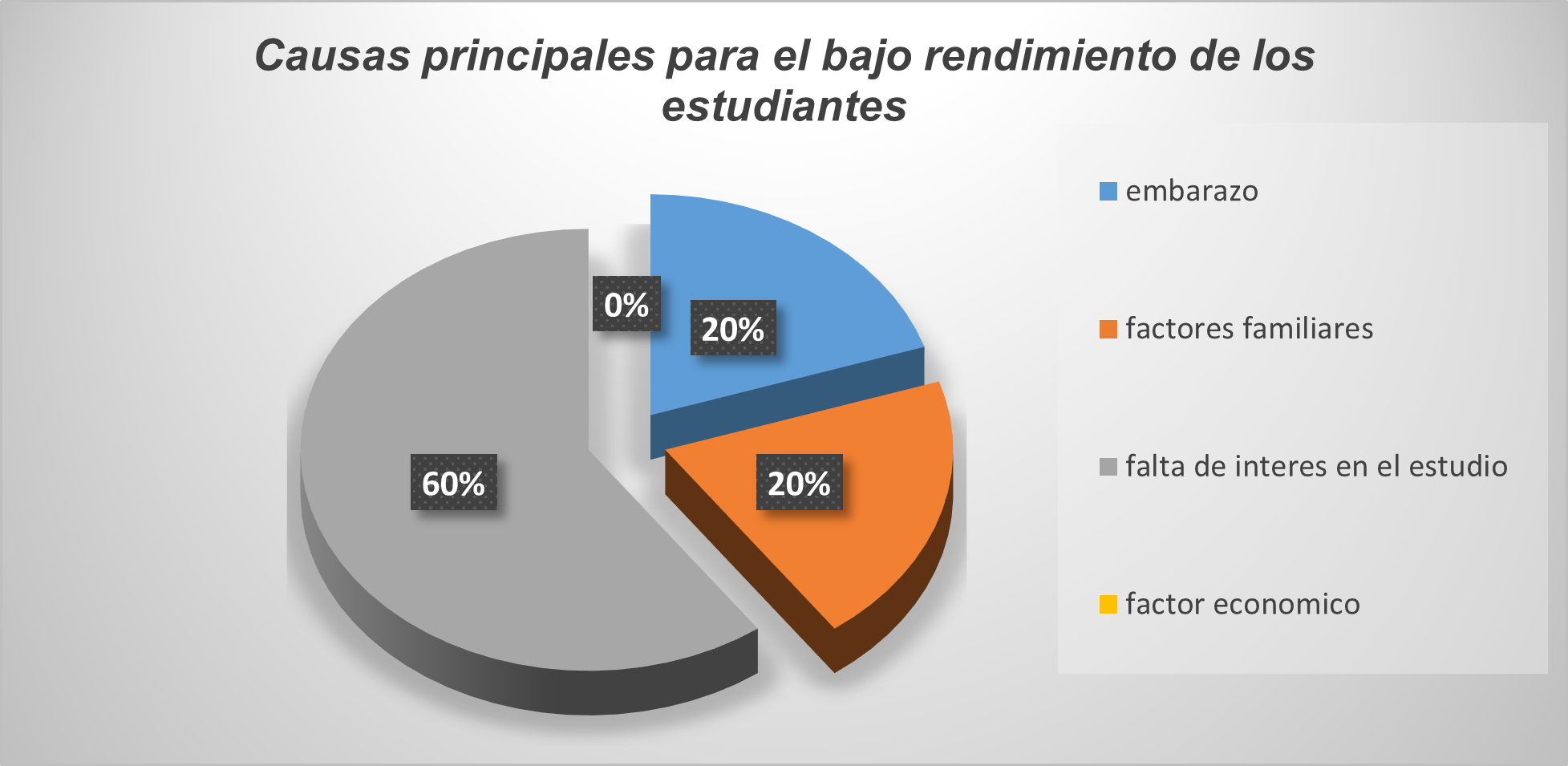 Abstract: Early pregnancy is a public and social health problem, the adolescent mother's health is affected, resulting in negative effects that decrease the chances of completing their studies with an excellent academic performance or providing for school dropout, which makes it difficult to obtain better living conditions, so the objective of this study was to determine the factors that negatively influence the low performance of pregnant students at the Pueblo Nuevo Educational Unit, in the Province of Manabí, in the process the descriptive model, addressing the respective definitions of the variables and describing the factors that influence this problem, the historical model was carried out based on bibliographic and secondary sources, acquiring information from key informants, the quantitative approach was very useful, for how much 100 high school students were sampled, including teenage mothers and 5 teachers from the educational unit. The research results provided that the main factors for a student to lower their academic performance are a lack of emotional support from their families, socioeconomic factors and the uneducated use of contraceptives. It is important to distinguish that the main cause for these students to drop out of their studies is their family's lack of motivation.