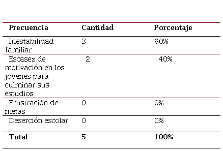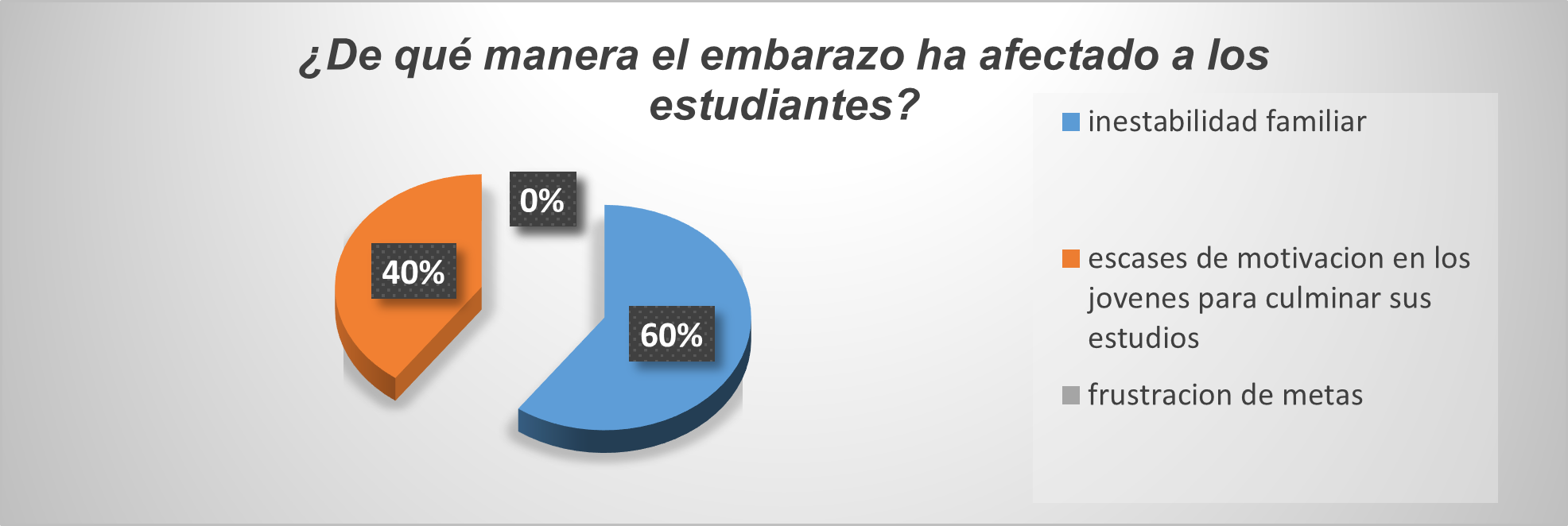 Análisis: Estos resultados obtenidos en la pregunta ocho, que trata sobre de qué manera ha afectado el embarazo a los estudiantes, con el 60% la inestabilidad familiar, siguiendo con el 40% la escasa motivación en los jóvenes para culminar sus estudios, lo que se refleja con un alto porcentaje que la inestabilidad familiar afecta a las estudiantes en estado de embarazo.