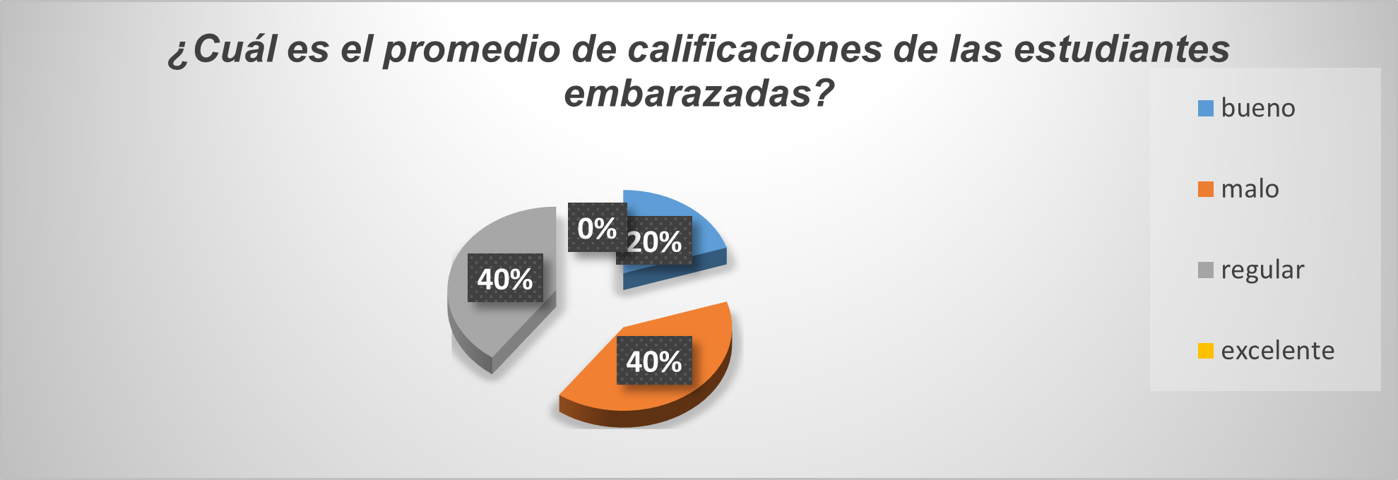 En el gráfico 18 se planteó la siguiente pregunta dirigida hacia los docentes ¿Cuál es el promedio de las estudiantes en estado de embarazo? Ellos manifestaron con un 40% regular y con un 40% malos. Estos resultados determinan que prácticamente un alto porcentaje de estudiantes en estado de embarazo tiene un bajo rendimiento académico, tomando en cuenta que los docentes conocen en muchos casos a las adolescentes embarazadas que desertaron o que abandonaron sus estudios, sin que lo padres se hayan acercado a dialogar para mirar posibilidades ellas terminen sus estudios. La falta de control y comunicación de padres a hijos afecta el nivel de embarazos en adolescentes.