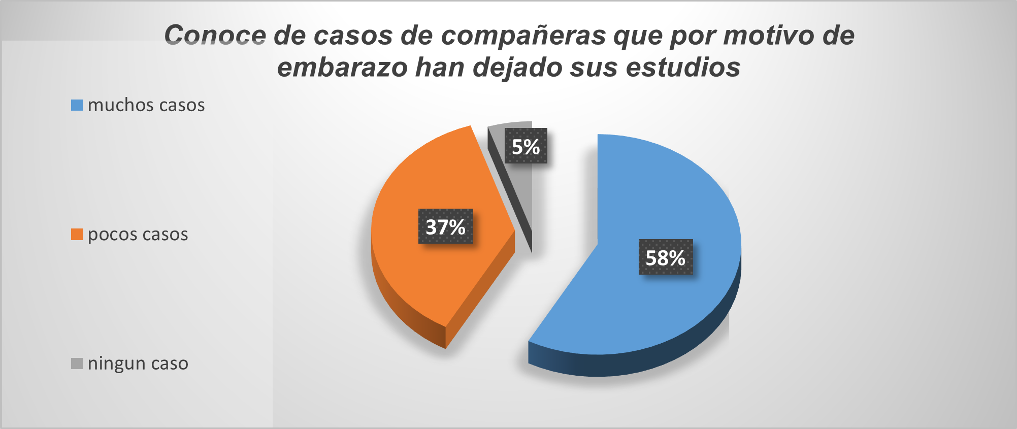 Análisis: Con respecto a la pregunta dos, existe un 58% de los estudiantes que conocen de casos de compañeras que han dejado sus estudios por motivo de un embarazo, un 37% en pocos casos, mientras que el 5% no conoce ningún caso, esto refleja que un alto porcentaje de estudiantes tienen conocimiento de casos de alumnas que han abandonado los estudios por motivo de embarazo.