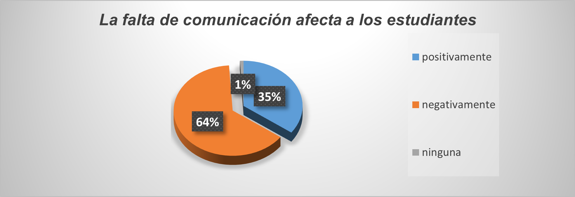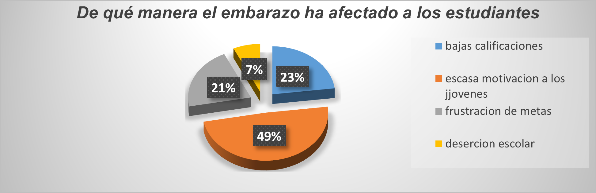 Los gráficos 8 y 17 se evidencia los resultados de la siguiente pregunta ¿De qué manera se considera que el embarazo ha afectado a las estudiantes, la misma que se formuló para alumnos y docentes en las encuestas?, de los estudiantes el 49% señaló la escasa motivación en los jóvenes para que culminen sus estudios, mientras que los docentes el 60% eligió la inestabilidad familiar los adolescentes que quedaron en embarazo considera en su familia les brinda menos apoyo. De hecho, se observó que los adolescentes con experiencia de embarazo evalúan a su familia de forma menos positiva, les brindan menos apoyo, es más desequilibrada e insegura, por lo tanto, el 49% de los estudiantes señalaron que la escasa motivación en los jóvenes para culminar sus estudios afecta de manera negativa hacia las estudiantes embarazadas, concordando así con el 64% de los estudiantes que señalaron a los factores familiares como una principal causa para que una estudiante en estado de embarazo baje su rendimiento académico y abandone sus estudios.