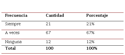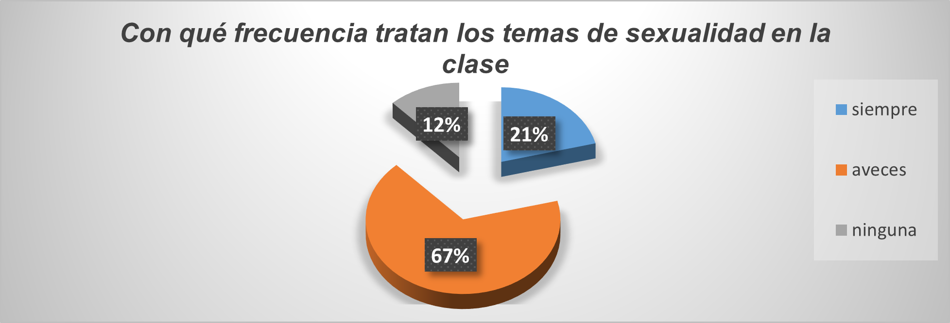 Análisis: Se analiza en la pregunta seis, sobre con qué frecuencia tratan los temas de sexualidad en la unidad educativa, los encuestados contestaron con un 67% que a veces, seguido de un 21% siempre y un 12% ninguna, esto refleja la importancia de adquirir información, mejorando la educación sexual en los estudiantes.