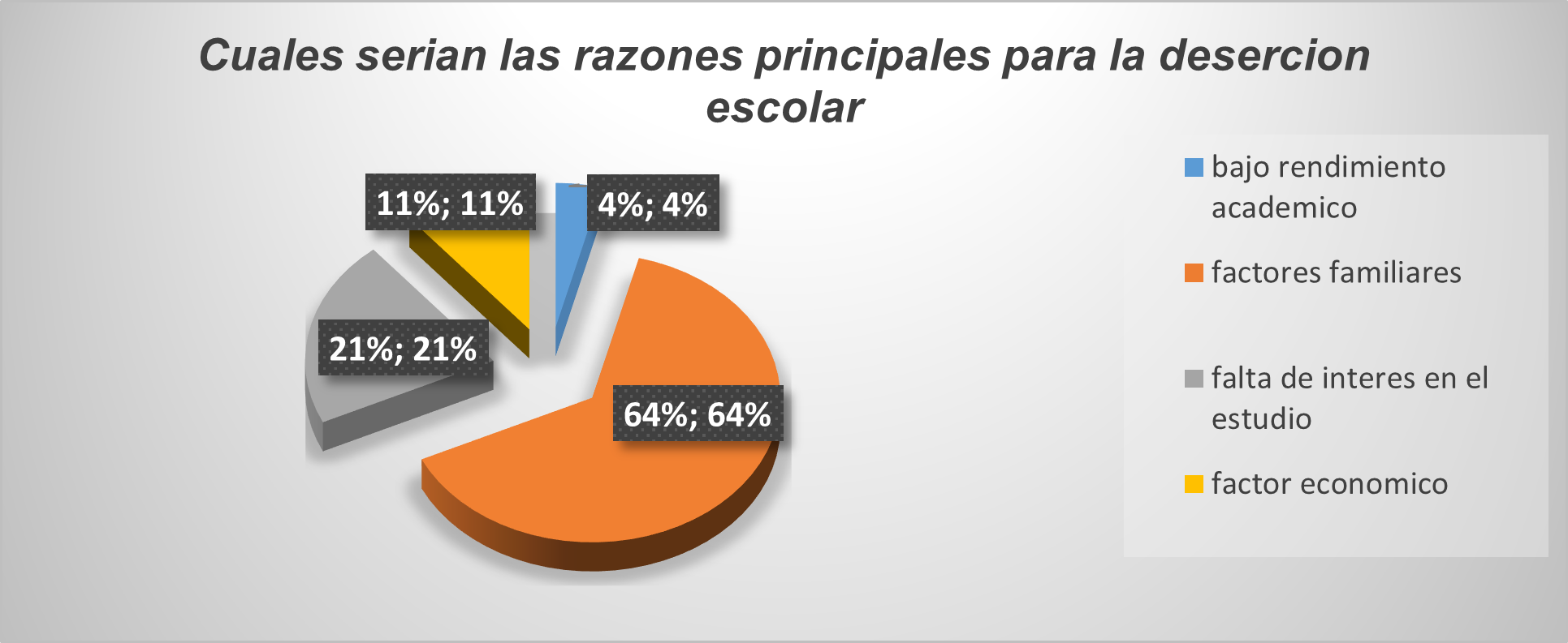 El gráfico 7 contiene la siguiente pregunta dirigida hacia estudiantes ¿Cuáles son las causas principales para que una estudiante embarazada abandoné los estudios? Estudiantes eligieron como un 64% los factores familiares, seguido con un 11% por el factor económico. Estos resultados corroboran lo expuesto por Ovando, constatando que las causas principales para que una estudiante embarazada deje los estudios son muchas, haciendo énfasis en la atención de la familia, por cuánto la principal causa que conlleva a la deserción y a una reacción depresiva del adolescente en curso de su embarazo puede ser fuerte y puede llevarla al desinterés de los estudios, por lo cual recomienda apoyar a la joven con el acompañamiento médico y psicológico con el fin de no afectar al desarrollo de la gestación y su desarrollo educativo (Ovando, 2006).