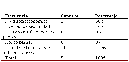 En contraposición a los resultados antes expuestos, la causa del embarazo en adolescentes no es específicamente la falta de dinero, sino que existiría una asociación de esta escasez de recursos con otros posibles factores de riesgo para un embarazo, como por ejemplo la ausencia de otras oportunidades culturales, la baja escolaridad de los padres, la necesidad de los padres de pasar más tiempo trabajando; lo que puede estar asociado a una menor supervisión de los padres hacia la joven, la evasión escolar etc. (Fonseca y Bastos, 2001). Así como afirman los autores que el bajo nivel socioeconómico de las adolescentes y sus familias es determinante en el rechazo de la gestación por parte de los familiares, de forma general se preocupan debido a la interrupción de la escolarización y de la formación profesional de la adolescente (Silva y Tonette, 2006).