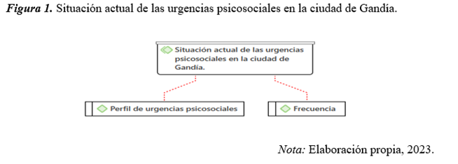 En la Figura 1 se desarrolla la categoría “Situación actual de las urgencias psicosociales en la ciudad de Gandía. y sus códigos correspondientes “Perfil de urgencias psicosociales” y “Frecuencia”.