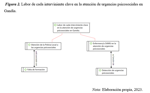 Los principales intervinientes en la atención de urgencias psicosociales en Gandía son el SAMU y la Policía Local. En el equipo SAMU, entre las funciones que lleva a cabo el/la enfermero/a SAMU se encuentran: la reanimación y el soporte vital del paciente grave, la detección de las urgencias psicosociales, registrar toda la información obtenida en el informe de cuidados de enfermería del SES y el traslado de pacientes al hospital, donde podrán activarse otros servicios intrahospitalarios. También pueden contactar con otros servicios, como es la Policía Local de Gandía en caso de ser necesario.