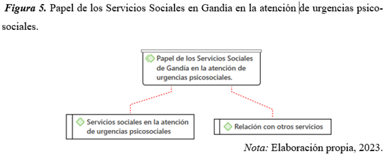 A continuación, en la Figura 5, se muestra la categoría “Papel de los Servicios Sociales en Gandía en la atención de urgencias psicosociales” y sus códigos correspondientes.