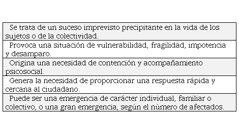 En la Tabla 1, se muestran las características que reúne la emergencia social según Arricivita (2013). Asimismo, Camús (2016, p. 247), define problema psicosocial como “un acontecimiento vital negativo, una dificultad o deficiencia ambientales, un estrés familiar o interpersonal, una insuficiencia en el apoyo social o los recursos personales o cualquier otro problema relacionado con el contexto en que se han desarrollado alteraciones experimentales por una persona”.