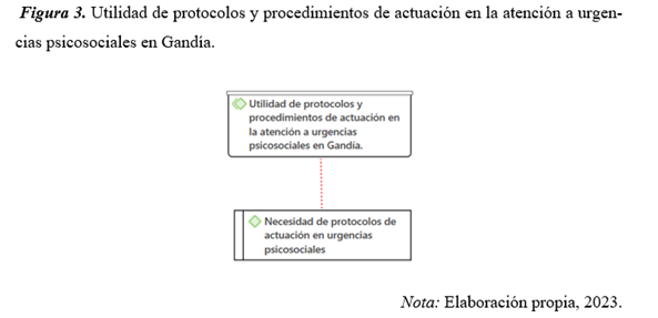 En la Figura 3 se muestra la categoría “Utilidad de protocolos y procedimientos de actuación en la atención a urgencias psicosociales en Gandía” y su código “Necesidad de protocolos de actuación en urgencias psicosociales”.