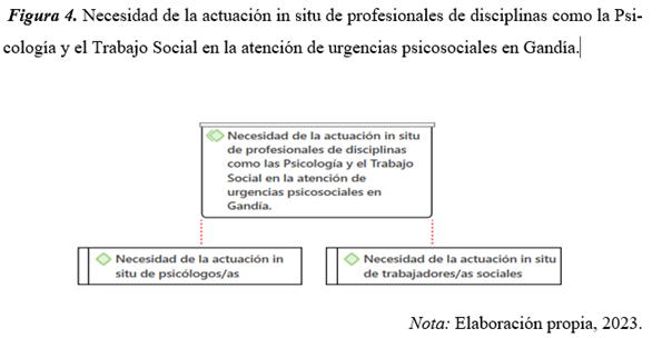 Por último, la Figura 4 donde se desarrolla la categoría “Necesidad de la actuación in situ de profesionales de disciplinas como la Psicología y el Trabajo Social en la atención de urgencias psicosociales en Gandía”.
