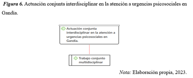 En la Figura 6, se muestra la categoría “Actuación conjunta interdisciplinar en la atención a urgencias psicosociales en Gandía” y su atributo correspondiente “Trabajo conjunto multidisciplinar”.