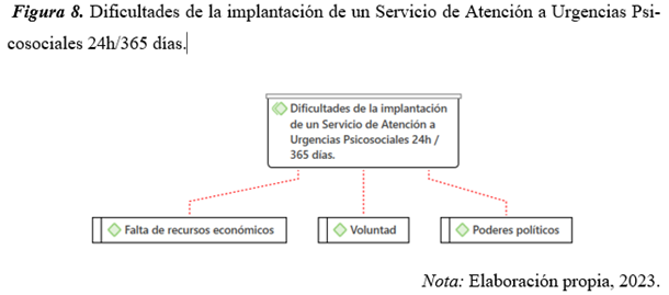 En último lugar, la Figura 8 muestra la categoría “Dificultades de la implantación de un Servicio de Atención a Urgencias Psicosociales 24h / 365 días” y sus atributos correspondientes.