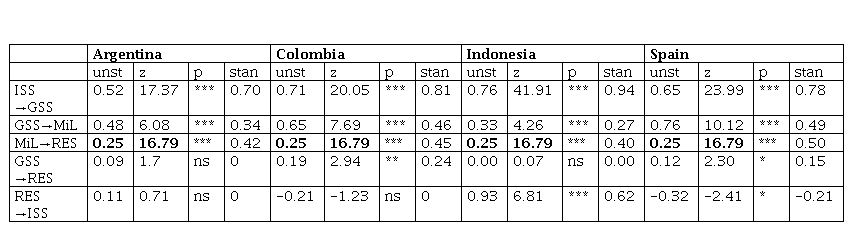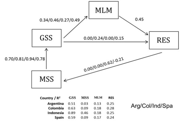 It is in Indonesia where this explained variance is highest at 89%. At the same time, it is in this country where the instrumental social support factor (ISS) has the greatest explained variance, 46%, compared to almost zero variance for the rest of the countries. The mediating factor Meaning in life (MiL) achieves a similar and moderate explained variance in all countries. Finally, we also see that the explained variance of resilience (RES) is similar among the countries with a value of 25%.