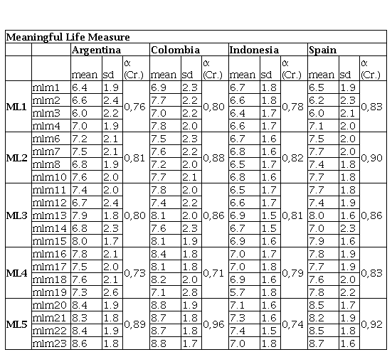 · Meaningful Life Measure (MLM) consists of 23 items with statements, which are scored from 1 to 10, from the lowest to the highest degree of agreement. For the translation and adaptation of the scale into Spanish, we followed the indications of Muñiz et al (2013). To check the language correspondence of the items, a double translation was carried out: from the original English version into Spanish and Indonesian and then back into English. The two translations of the instrument were carried out by two independent professionals.