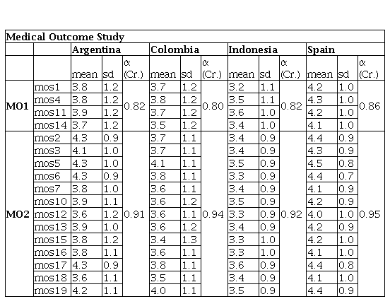 · The Medical Outcome Study - Social Support Survey (MOS-SSS) consists of 19 items with respondents indicating the frequency of support received in terms of help in cases of illness, being able to talk to someone about personal problems, receiving advice, trusting or having a good time with someone (1 being never and 5 always). It was adapted and translated from English into Spanish and Indonesian, following the same procedure as above.
