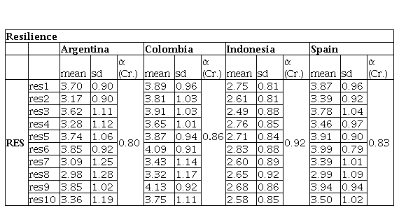 The Resilience scale has similar Cronbach's alphas for all countries. It is shown to be unifactorial. The comparison between both models does not show any notable differences. It presents a hierarchical omega of 0.87.