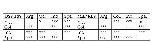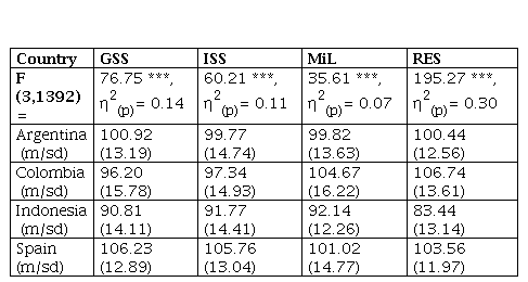 Table 6 shows the values of the F statistic for the main country effect in the four factors studied as well as the means and sd. of the four outcome variables studied. The largest country-linked effect size is found in Resilience (η.(p) = 0.30) and the smallest for Meaning in Life (η.(p) = 0.07). The explained variance values for the other two factors (ISS and GSS) are 0.14 and 0.11, respectively.