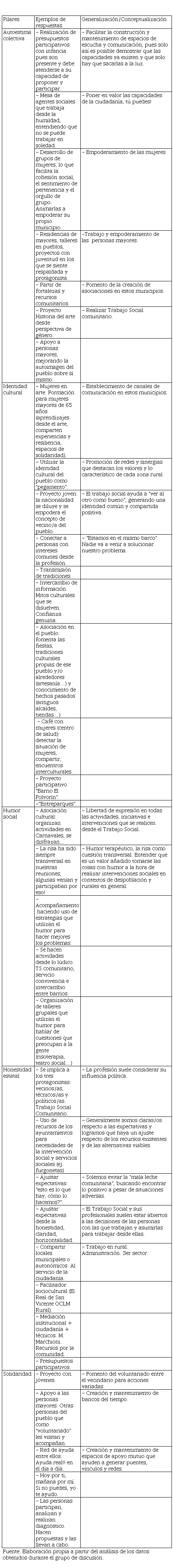 De acuerdo a las diferentes dimensiones o pilares de la resiliencia comunitaria, aquí se observan algunos ejemplos de respuestas de los grupos reducidos y la posterior generalización realizada por el grupo en conjunto con el objetivo de conceptualizar dichas respuestas: