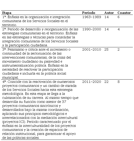 El análisis bibliométrico ha permitido establecer una clasificación por etapas, éstas se corresponden con un cambio o avance significativo en el argumentario de su planteamiento teórico-metodológico (Tabla 2):