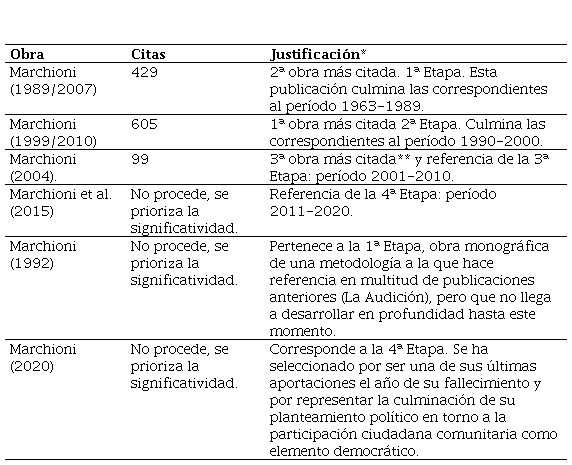 Una vez comentadas y contextualizadas algunas de sus obras que permiten acercarnos a una extensa descripción de su posicionamiento en torno a la acción comunitaria y a las raíces políticas, científicas y metodológicas de ésta; se han seleccionado dos obras en las que se desarrollan dos ideas también centrales e incluidas en los textos anteriores. Ambas representan dos elementos distintos, aunque interrelacionados y fuertemente enraizados en el planteamiento técnico y político de nuestro autor. Se trata de la “Audición” como metodología de investigación participativa (Marchioni, 1992), y de la participación ciudadana como expresión democrática (Marchioni, 2020).