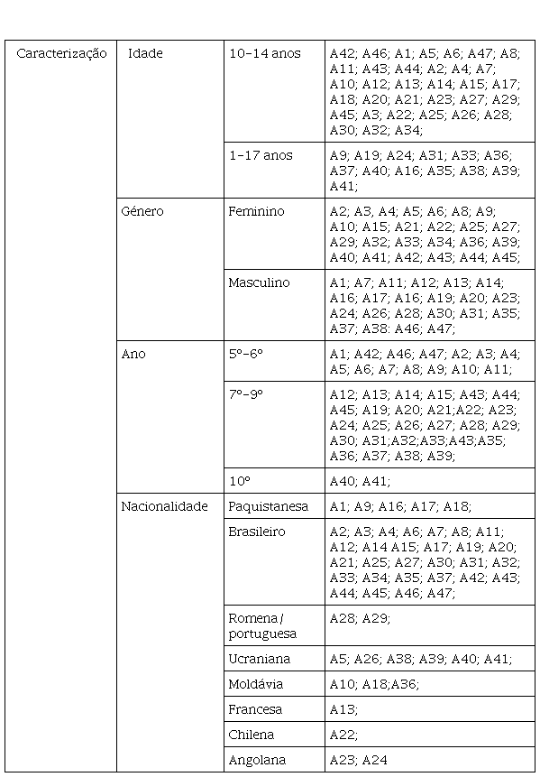 Foram realizadas entrevistas semiestruturadas aos alunos, contando com a participação de 47 alunos, que frequentam entre o 5º e o 10º ano. Com a aplicação da entrevista foi possível estar em contacto com os alunos migrantes, criando, assim, um contacto próximo e bastante benéfico. De seguida é apresentado, de acordo com os dados recolhidos, a caracterização dos alunos entrevistados.