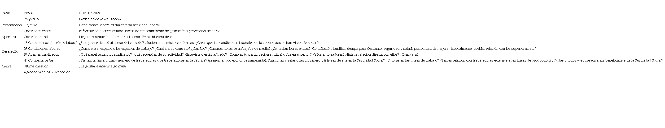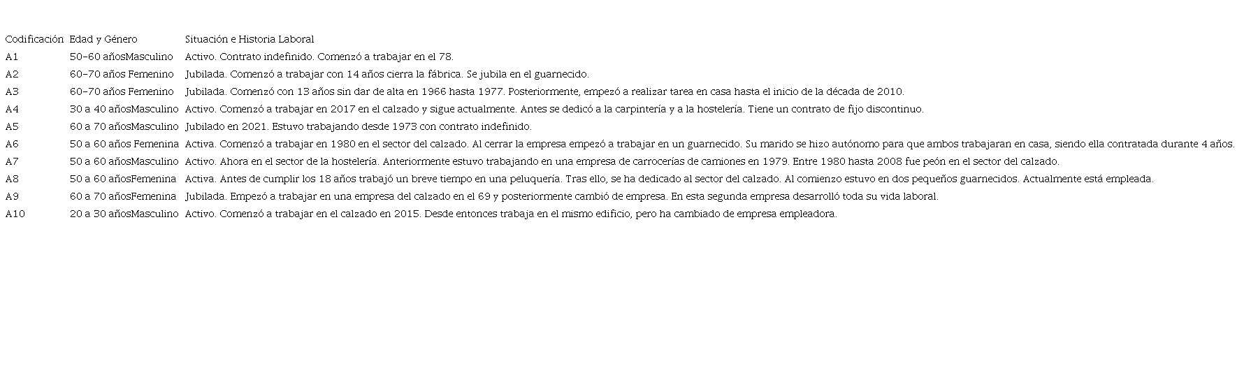 La ejecución de entrevistas semiestructuradas ha revestido una importancia fundamental, ya que estas han servido como herramienta principal para articular y sistematizar la narrativa en dos conjuntos sustanciales. El primero de estos abarca los estudios de relevancia vinculados a la temática, mientras que el segundo se centra en las condiciones laborales, como se deducen de los testimonios de los trabajadores y trabajadoras de la industria del calzado.