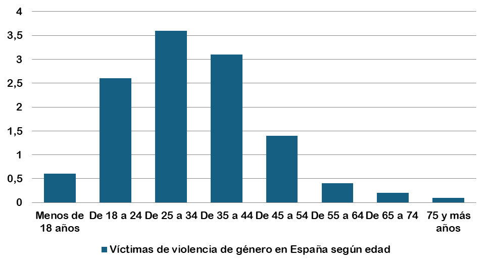 Según la Fundación Adecco en su informe Violencia de género y empleo 2023, en España, el aumento del 12% en las denuncias por violencia de género refleja un creciente reconocimiento y sensibilización hacia este problema social (Fundación Adecco, 2023). El Instituto Nacional de Estadística, en su informe “Estadística de Violencia Doméstica y Violencia de Género (EVDVG) Año 2022”, recoge que el número de mujeres víctimas de violencia de género aumentó un 8,3% en el año 2022, hasta 32.644. Casi la mitad de esta cifra, específicamente el 48,1%, se encontraban en el rango de edades de 30 a 44 años. La tasa de víctimas de violencia de género fue de 1,5 por cada 1.000 mujeres de 14 años en adelante. La cifra más alta se registró en el grupo de edad de 25 a 34 años, donde hubo 3,6 víctimas por cada 1.000 mujeres (ver Gráfico 1), (Instituto Nacional de Estadística, 2023).