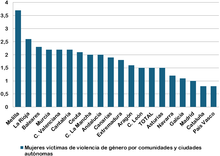En el citado informe “Estadística de Violencia Doméstica y Violencia de Género (EVDVG) Año 2022”, del Instituto Nacional de Estadística (INE), también se recoge que La Rioja, en términos relativos, posee en comparación con el resto de las comunidades autónomas, la segunda mayor tasa de víctimas de violencia de género inscritas por cada 1.000 mujeres de 14 o más años con un 2,6% (Instituto Nacional de Estadística, 2023), (ver Gráfico 2).