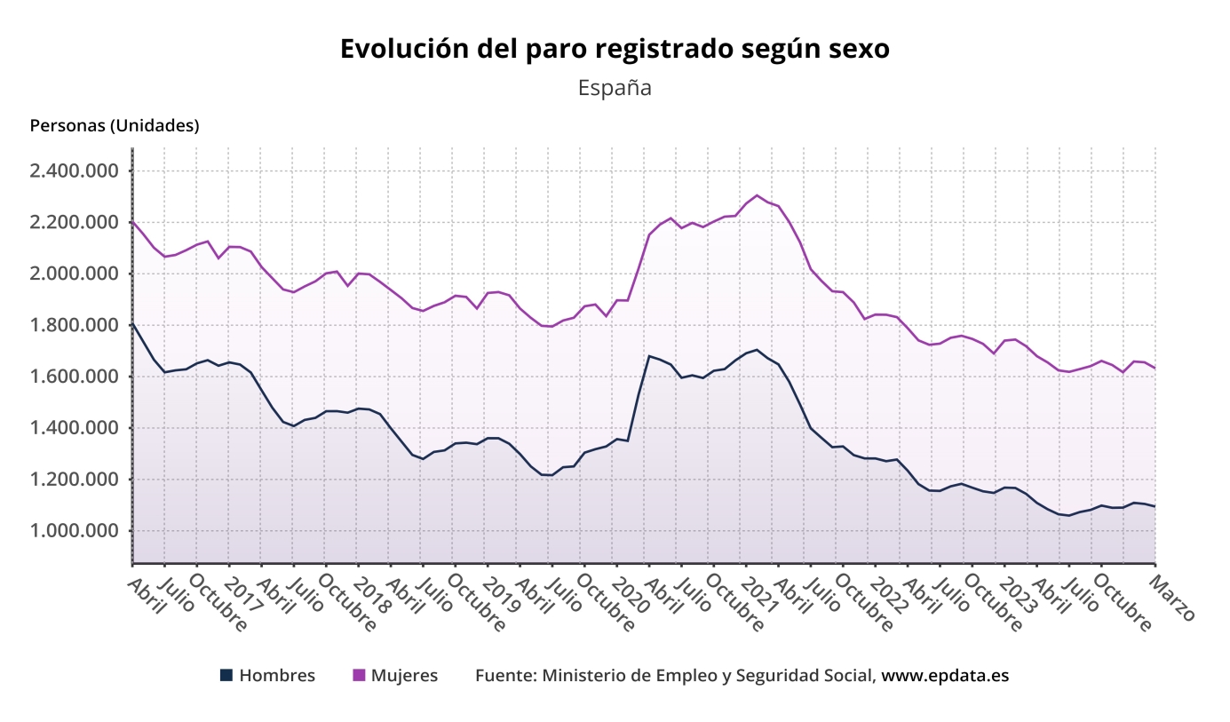 En cuanto al paro registrado, según el Ministerio de Trabajo y Economía Social (2024), el número total de parados en España se situó en 2.727.003 personas en el mes de marzo de 2024; de los cuales se contabilizaron 1.094.446 hombres desempleados, frente a las 1.632.557 mujeres paradas. Lo que supone un 20 % más de mujeres desempleadas que hombres (ver Figura 3).