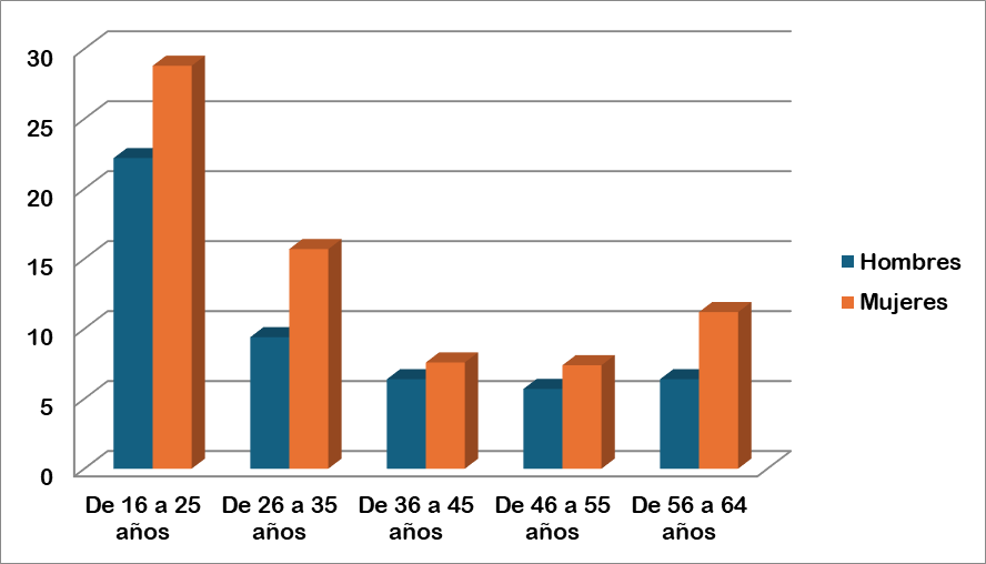 En el Informe Mujeres y Hombres en La Rioja. Año 2022, elaborado por el Instituto de Estadística de La Rioja (Gobierno de La Rioja, 2022), revela que la tasa de paro en la comunidad autónoma de La Rioja para el año 2022 presenta importantes diferencias por edad y sexo. Las mayores discrepancias corresponden al grupo de edad entre los 16 y 25 años, donde existe una mayor brecha laboral de género. La tasa se sitúa en el 28,8% para las mujeres frente al 22,2 para los varones. El siguiente grupo de edad femenino con mayor magnitud de paro es el grupo entre los 26 y 35 años, con un 15,7% frente al 9,4% para los varones (ver Gráfico 4).