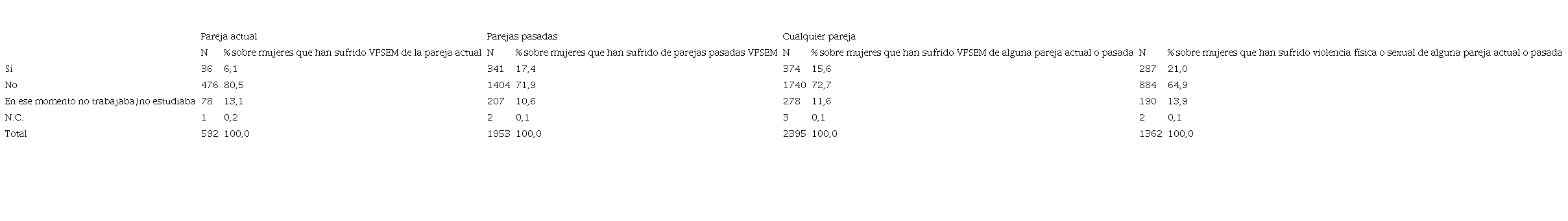 Asimismo, también recoge que el 21,0% de las mujeres que han sufrido violencia física o sexual por parte de sus parejas, no acudieron a su lugar de trabajo o estudio por un tiempo determinado como consecuencia de los episodios de violencia (9,4%, 52 en el caso de la violencia de la pareja actual, 22,2%, 53 entre las que la han padecido de parejas pasadas) (Delegación del Gobierno contra la Violencia de Género, 2020). (Ver Tabla 1).