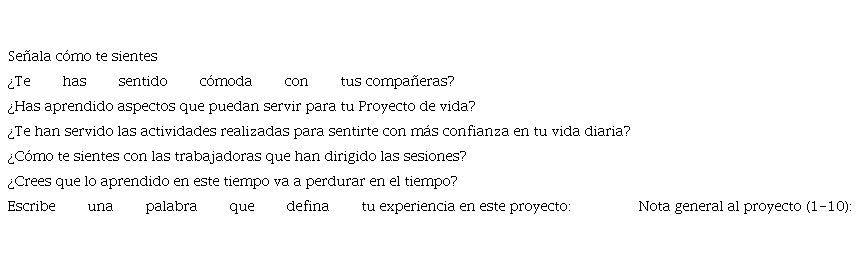 Al finalizar las actividades propuestas en el proyecto, se realizará una entrevista individual con cada mujer participante a modo de finalización o cierre. Junto con ella se valorará su satisfacción general, su evolución y, en su caso, su derivación a su trabajadora social de referencia para realizar seguimiento de su situación o a otros recursos o actividades que pudiese precisar.
