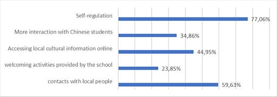 As shown in the data, self-psychological regulation and building relationships with locals were the most widely recognized strategies for adaptation. Notably, 77% of participants reported relying on self-psychological adjustment when dealing with culture shock. In contrast, only 23.85% opted to adapt through the welcome activities organized by their universities, highlighting the limited impact of institutional support initiatives.