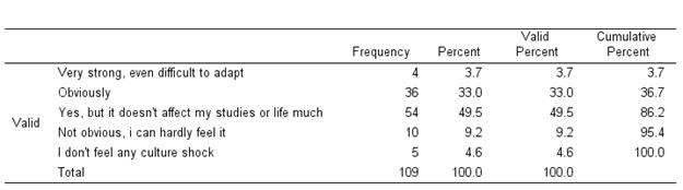 The survey results indicate that the vast majority of students experience varying degrees of culture shock in both academic and daily life. These cultural challenges are mainly concentrated in the following areas: