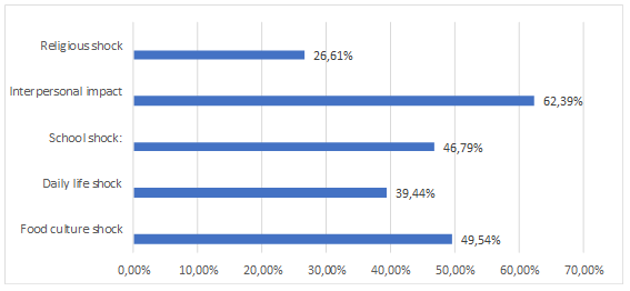 According to the results of the questionnaire analysis, interpersonal impact, school shock and food culture are the main areas of cultural shock, among which interpersonal impact issues have the greatest impact, accounting for 62.39%.