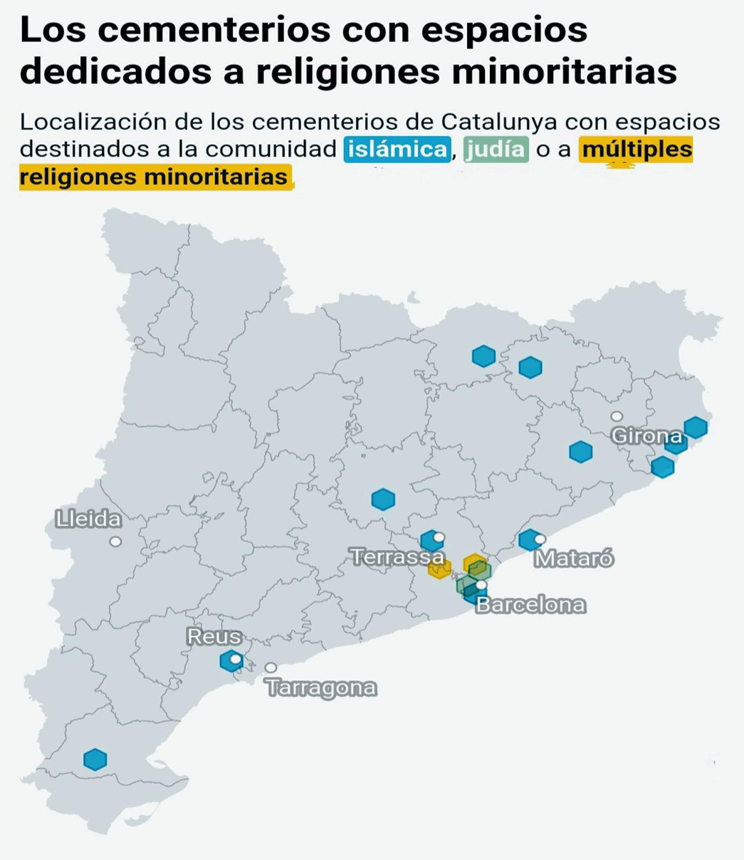 Hasta hace poco, solo Manresa, Calonge, Sant Feliu de Guíxols y Barcelona contaban con espacios para musulmanes en sus cementerios. Últimamente, en 2021 el cementerio de Collserola estrenaba un recinto islámico con 86 tumbas nuevas de un total de casi 260 para musulmanes. Algunos municipios según elperiodico.com (2019) como Manresa (Bages), Calonge (Baix Empordà), Sant Feliu de Guíxols (Baix Empordà) y Barcelona tienen espacios habilitados para enterrar las personas de la fe musulmana y tienen zonas para limpiar los cadáveres y poder enterrarlos bajo tierra y en dirección a la Meca.